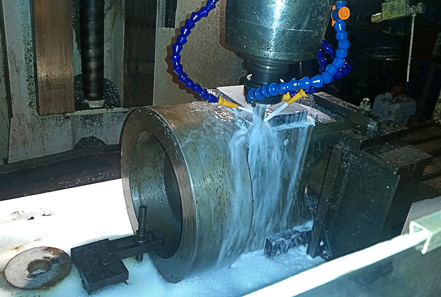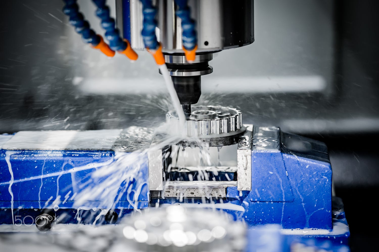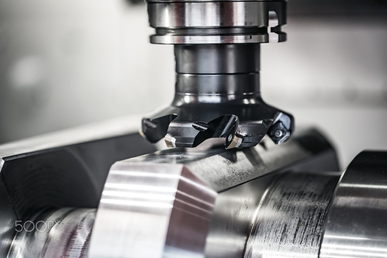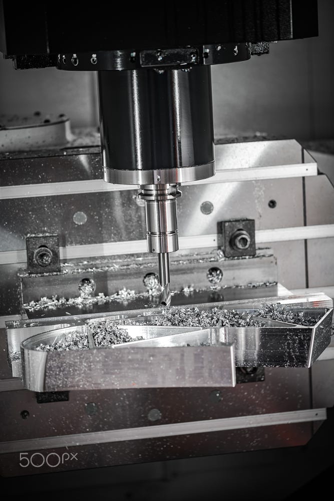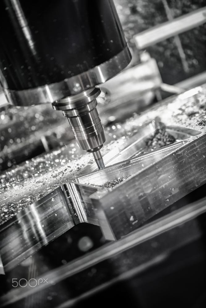 • Metalworking CNC milling machine. Cutting metal modern processing technology. Small depth of field. Warning - authentic shooting in challenging conditions. A little bit grain and maybe blurred.